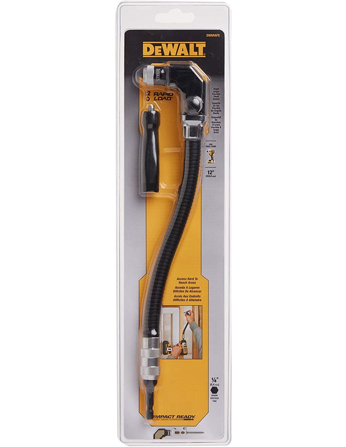 Le renvoi d'angle DeWALT DWARAFS à arbre flexible d'une longueur de 30,5 cm offre la capacité à l'utilisateur d'accéder aux recoins les plus difficiles d'accès avec sa visseuse.