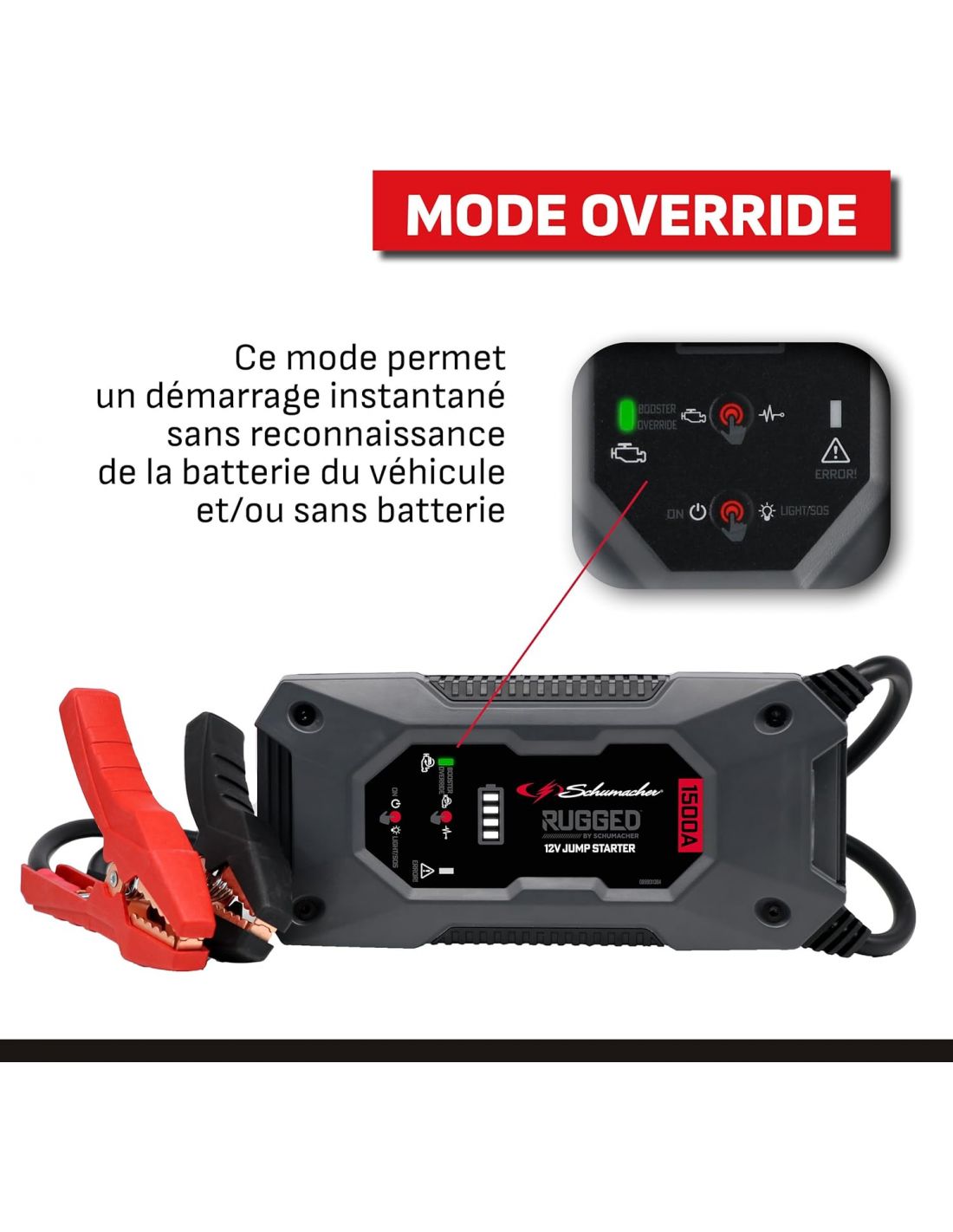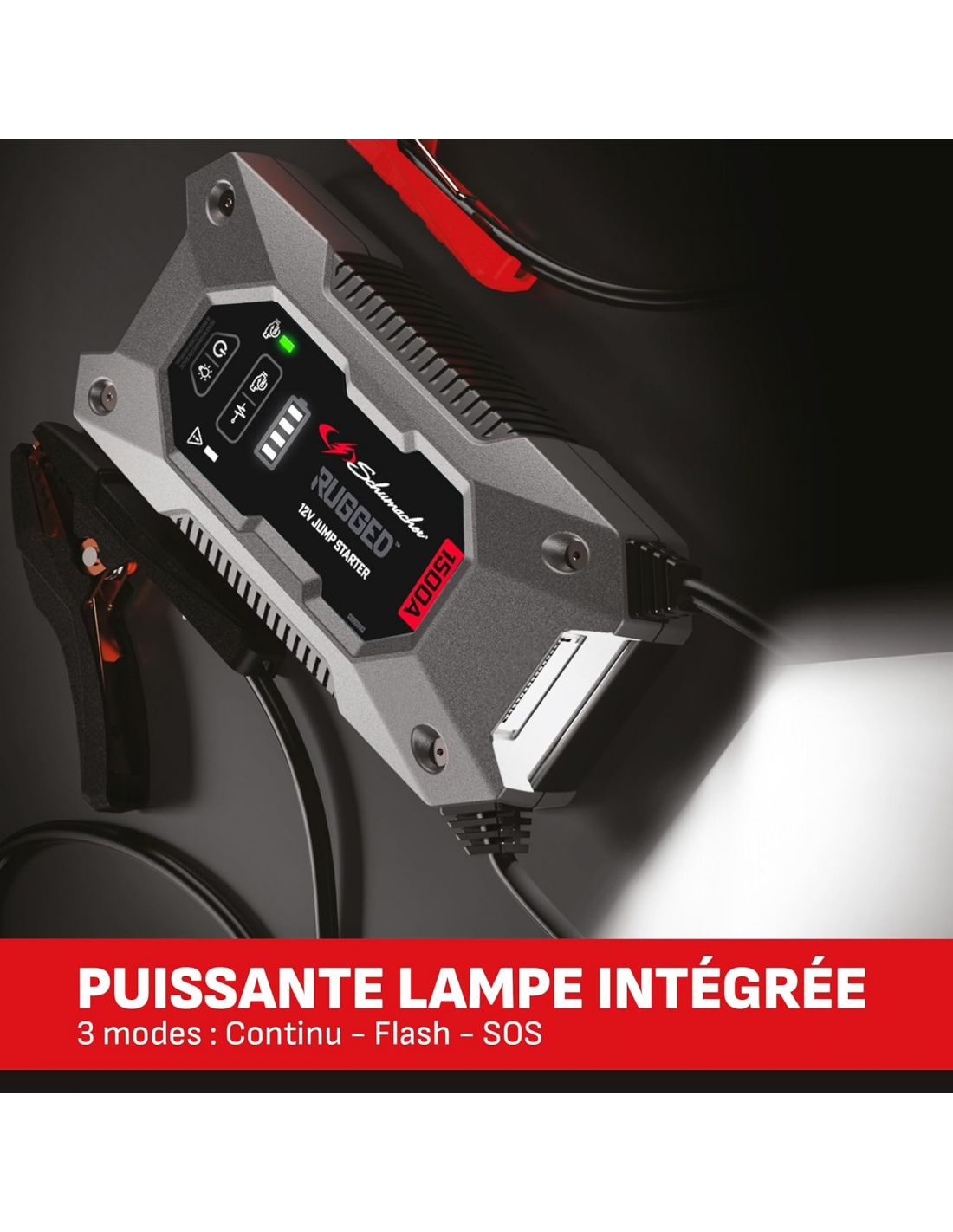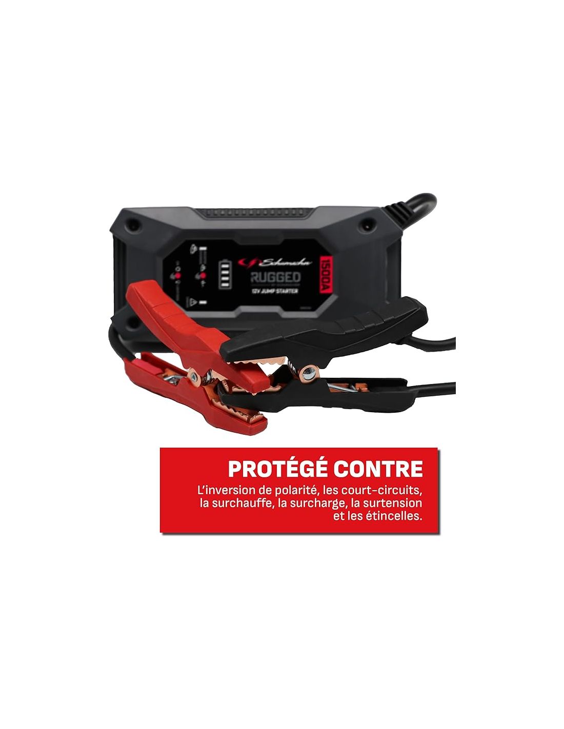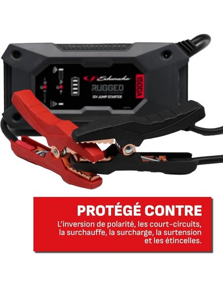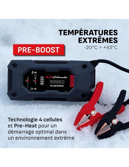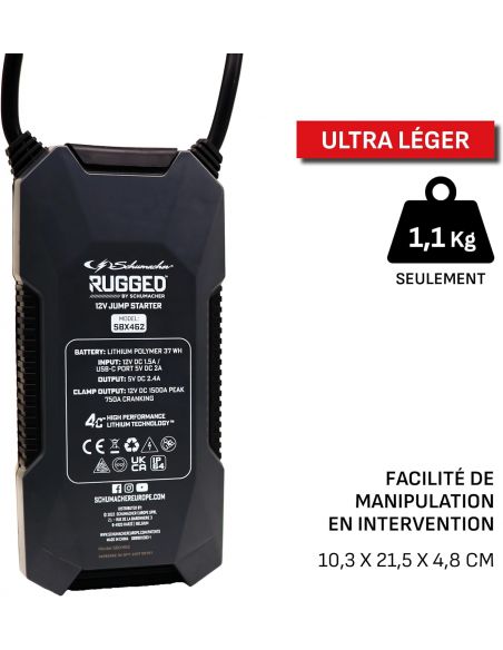 Découvrez le Booster RUGGED 12V 1500A Schumacher SBX462, référence incontournable pour toutes vos situations d'urgence sur la route. Avec une puissance impressionnante de 1000A, ce booster est conçu pour redémarrer rapidement les batteries de véhicules, des voitures aux camions. Ce booster offre jusqu'à 35 démarrages en une seule charge !