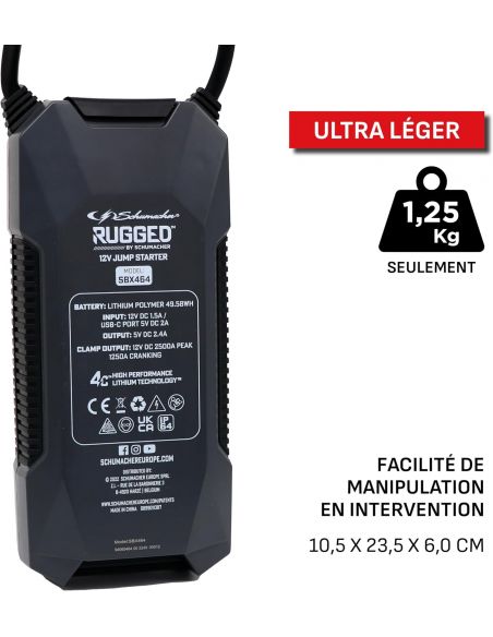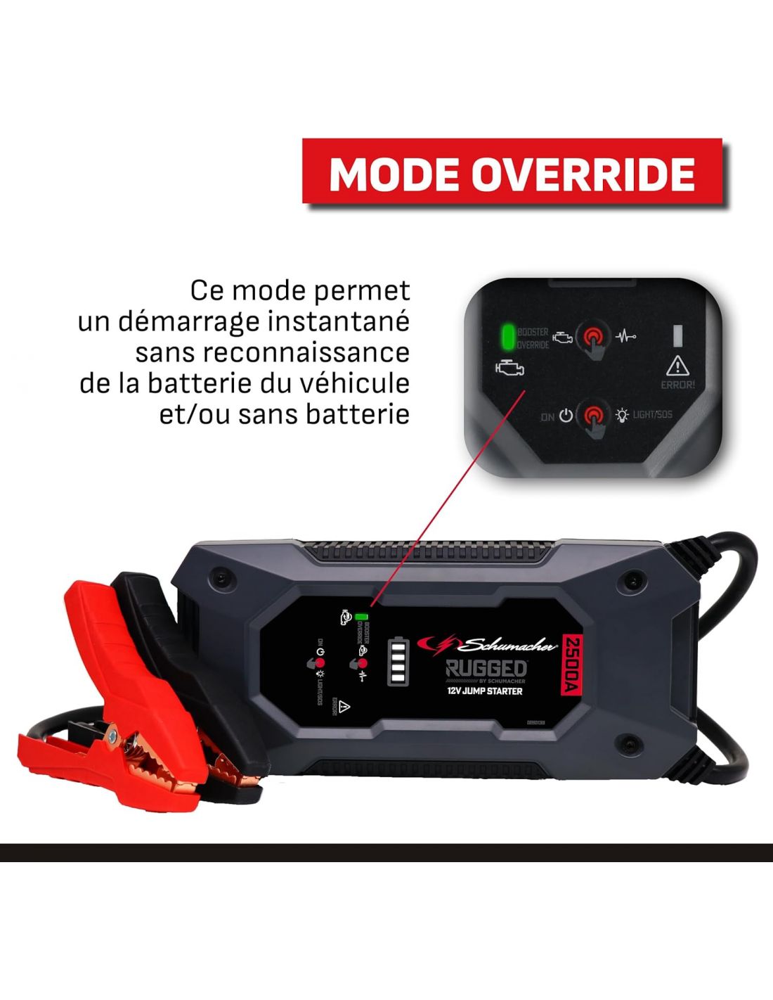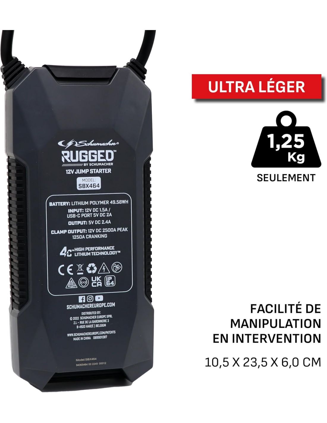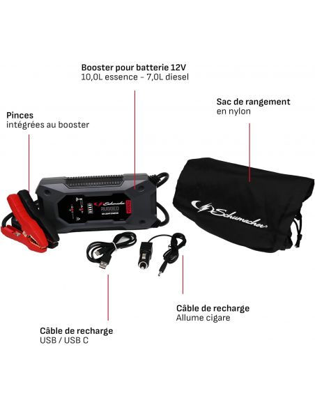 Découvrez le Booster RUGGED 12V 2500A Schumacher SBX464, référence incontournable pour toutes vos situations d'urgence sur la route. Avec une puissance impressionnante de 1000A, ce booster est conçu pour redémarrer rapidement les batteries de véhicules, des voitures aux camions. Ce booster offre jusqu'à 50 démarrages en une seule charge !