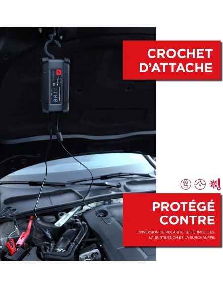 - Fonction maintien de charge: une fois la charge finie le chargeur se met automatiquement en mode maintien, assurant une charge complète de la batterie