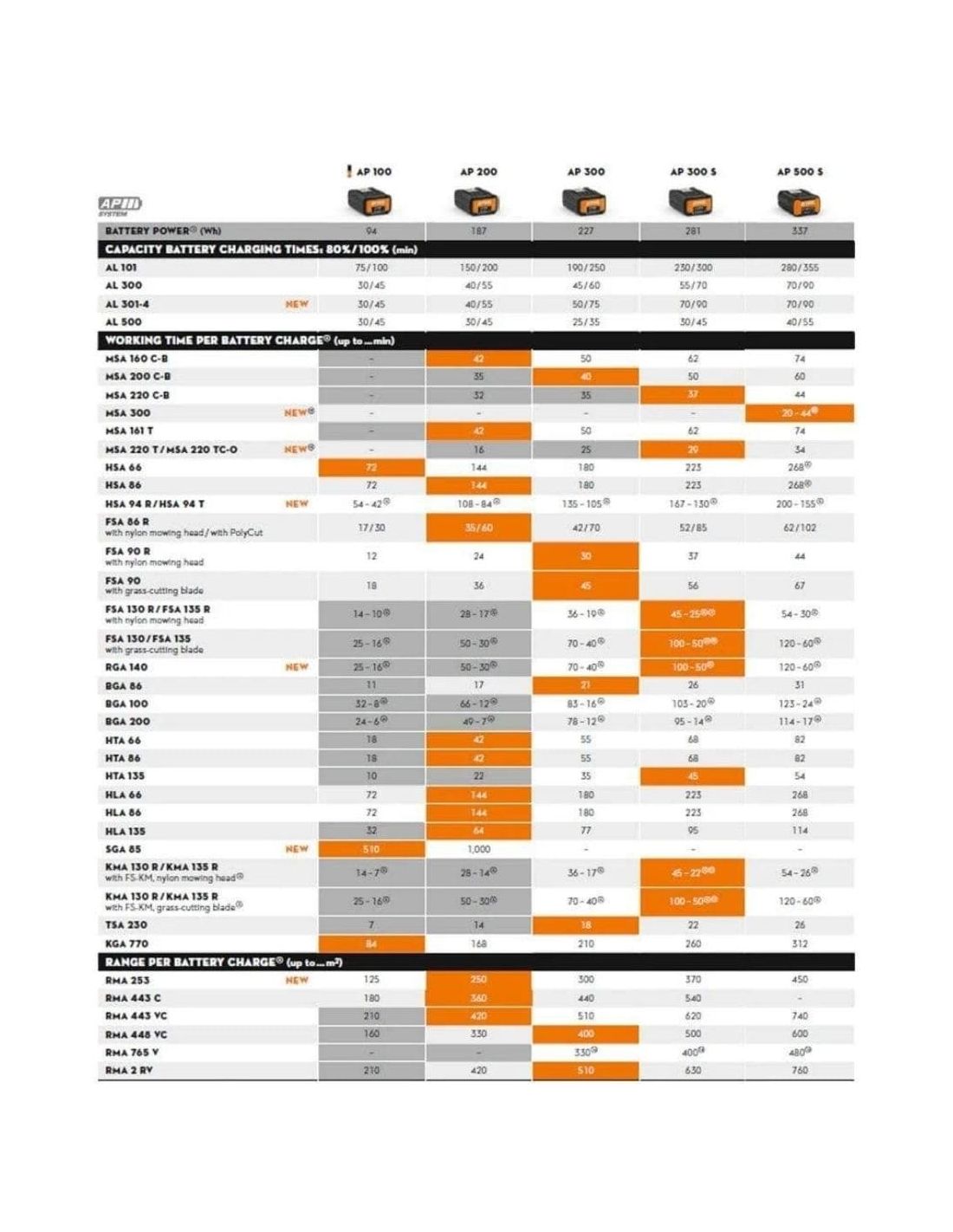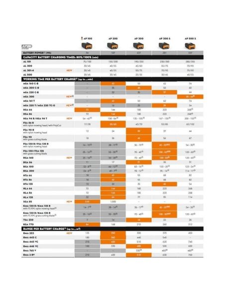 - Compatibilité étendue : fonctionne avec tous les outils du SYSTEM AP (tronçonneuses, souffleurs, débroussailleuses…) et les chargeurs AL 101 / 301 / 301-4 / 500..
